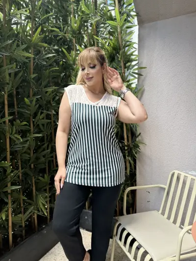 KADIN BÜYÜK BEDEN KOLSUZ DANTEL DETAY LİKRALI VİSKON BLUZ