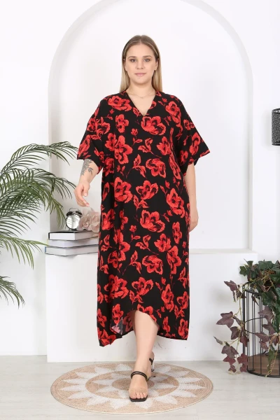 KADIN BÜYÜK BEDEN CEPLİ V YAKA DOKUMA VİSKON ELBİSE
