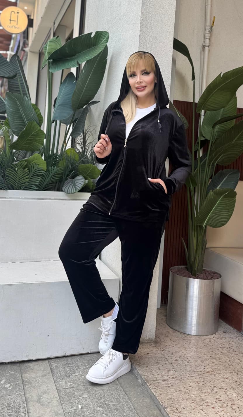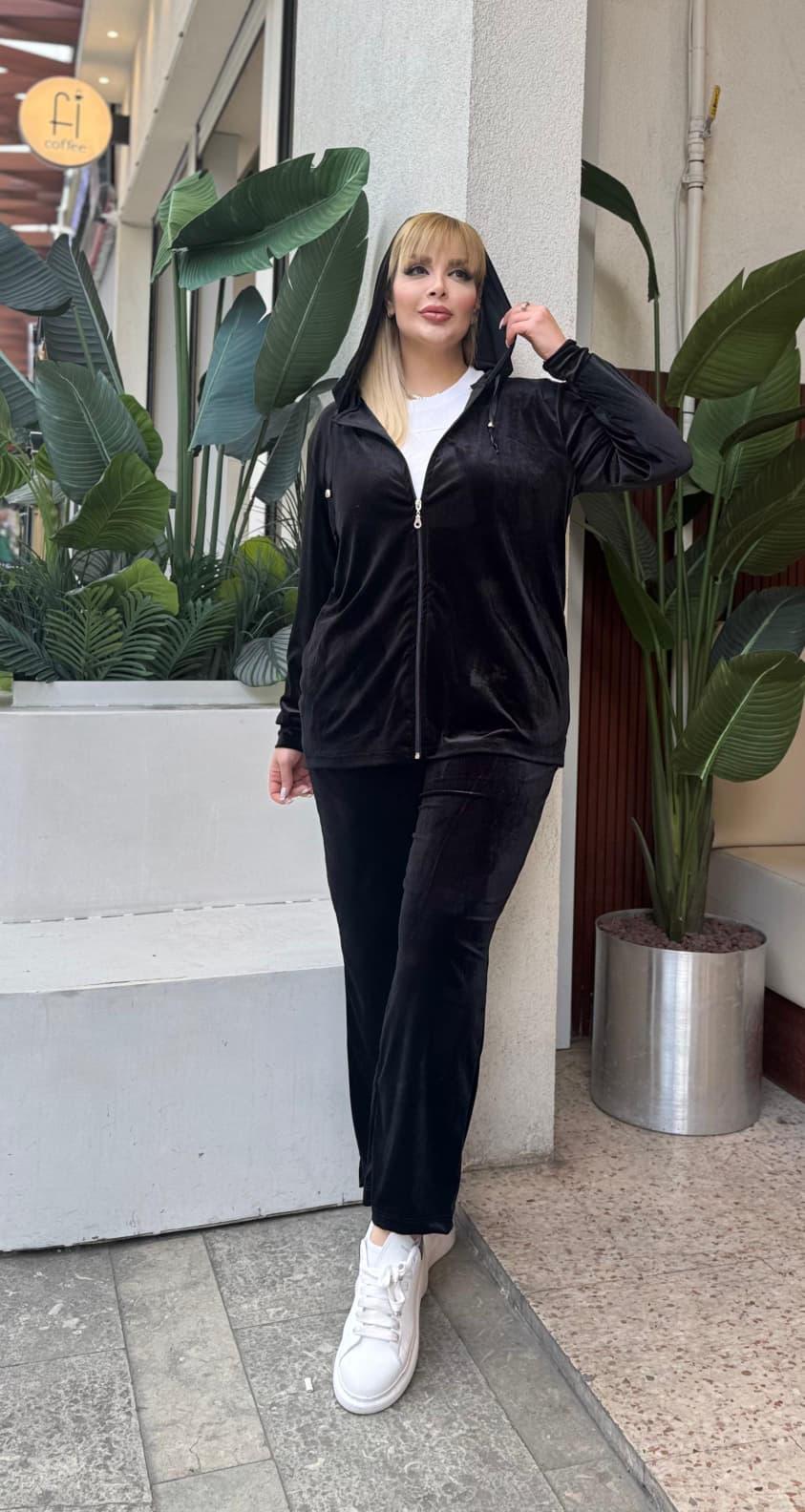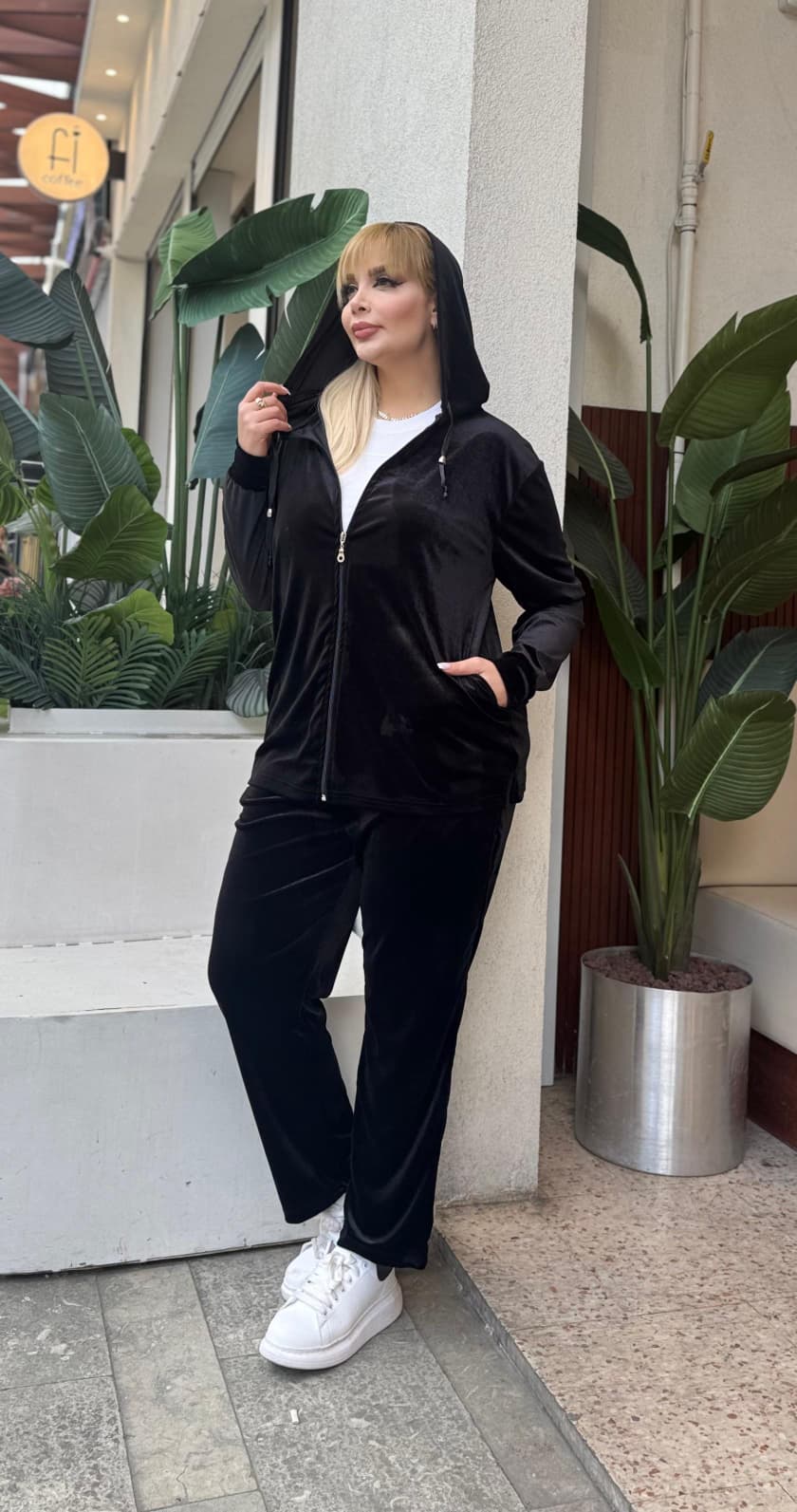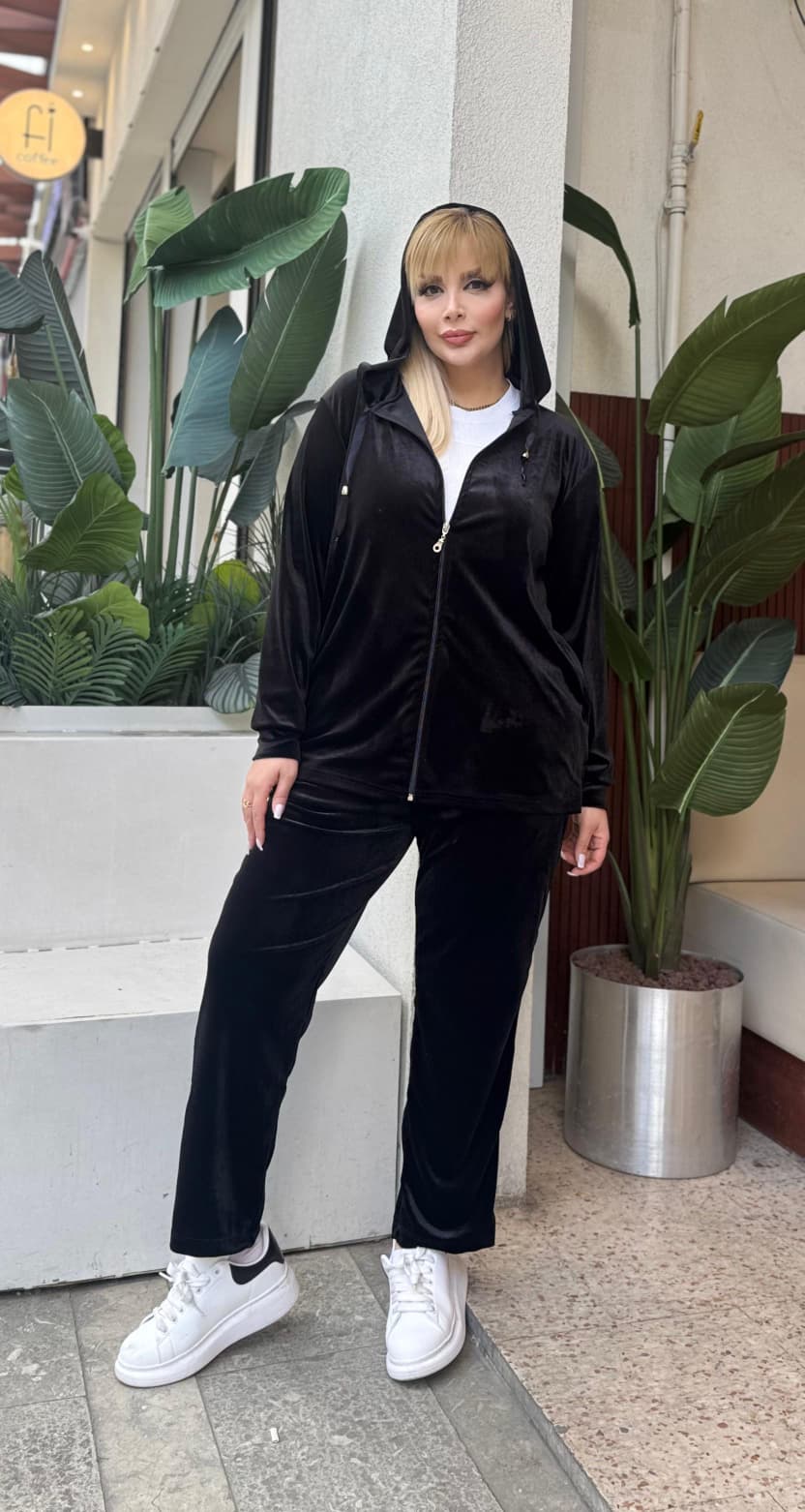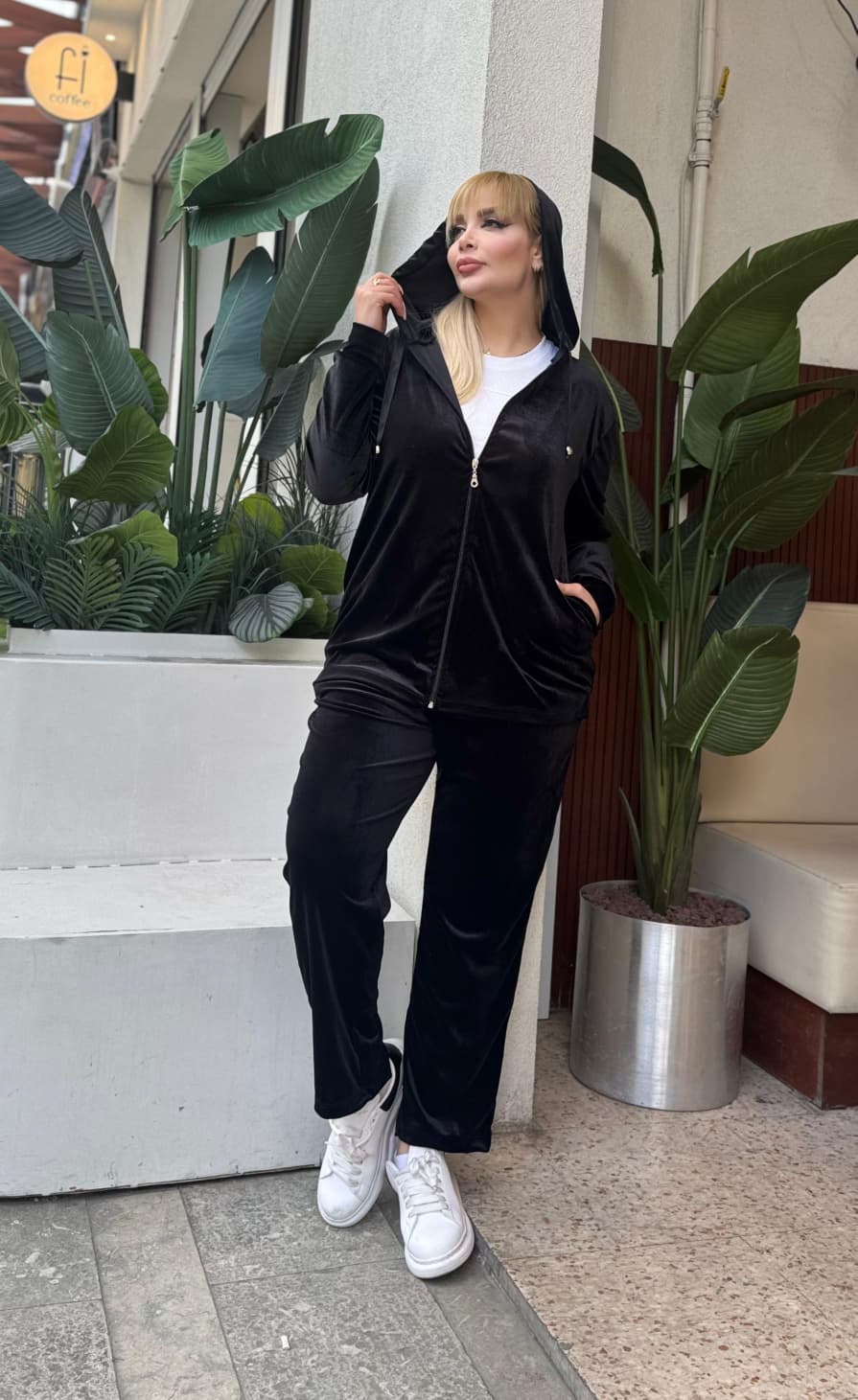 KADIN BÜYÜK BEDEN KAPŞONLU CEPLİ FERMUARLI LİKRALI KADİFE TAKIM