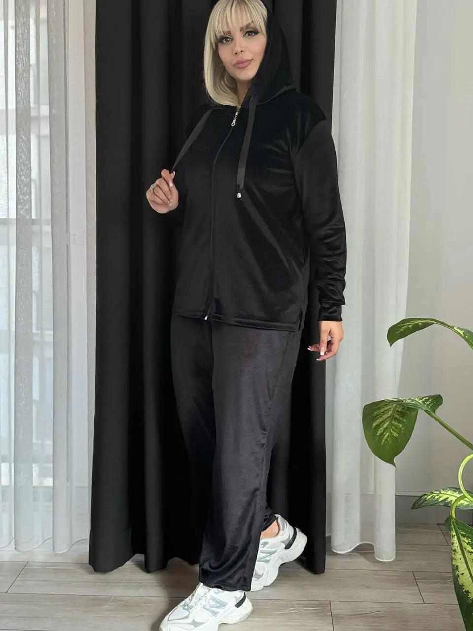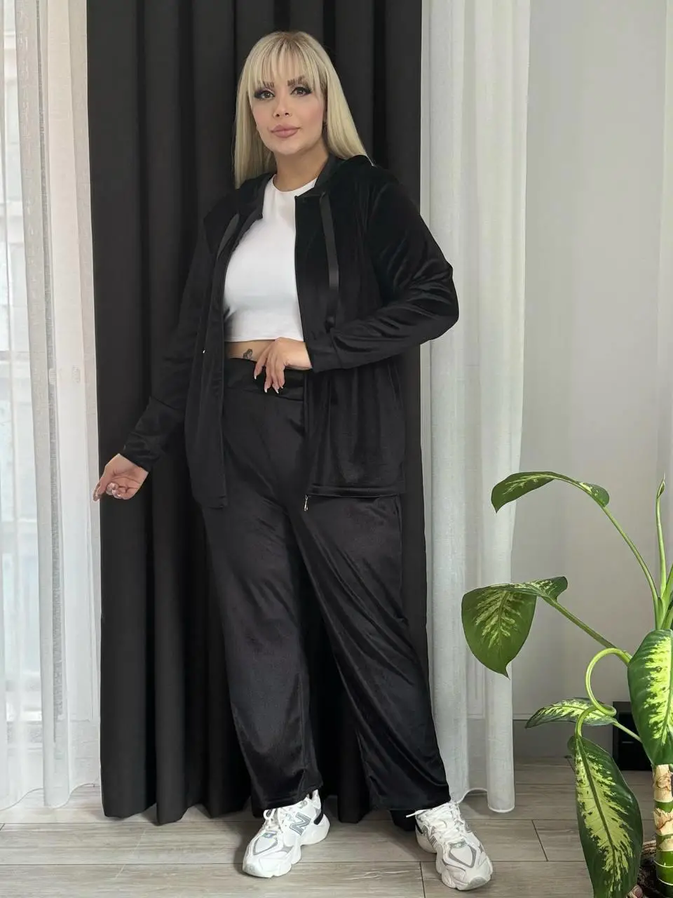 KADIN BÜYÜK BEDEN KAPŞONLU FERMUARLI ESNEK İTHAL KADİFE TAKIM