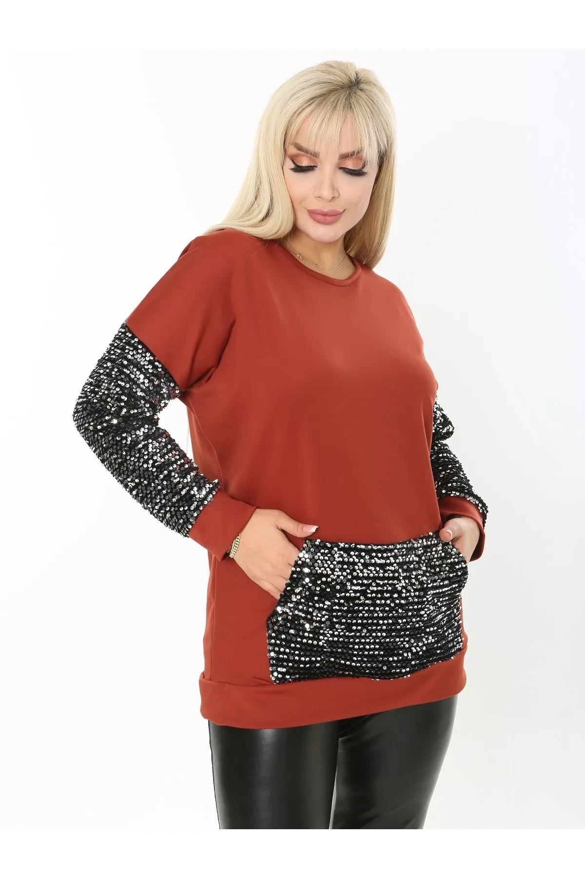 KADIN BÜYÜK BEDEN KANGURU CEP KOL ETEK PUL PAYET DETAY ESNEK SWEATSHIRT